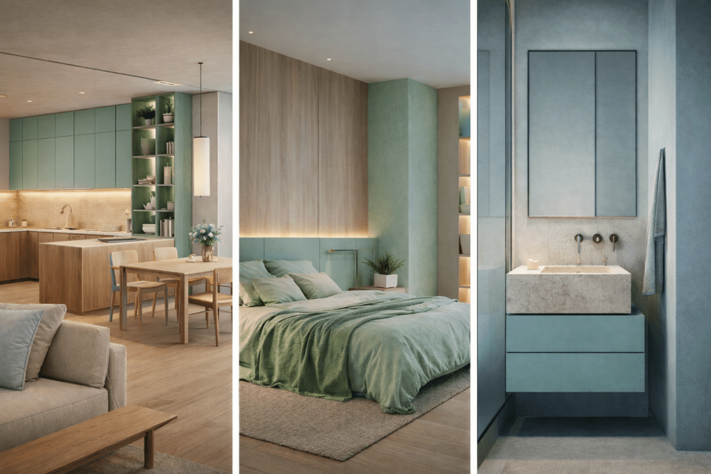 Rok 2026 přináší odklon od výrazných barev směrem k přirozeným tónům. Béžová, šedá, písková, přírodní dřevo a kamenné odstíny vytvářejí nadčasový základ interiéru.